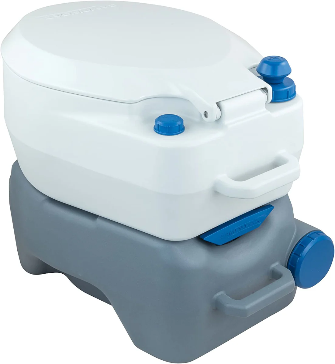The portable Campingaz camping toilet Portable 20 L is ideal for camping and travelling. For better comfort, the seat height has been increased to 41 cm and the seat has been widened. Integrated handles make transport easier. The seat and bowl feature an antimicrobial barrier that inhibits odour and inhibits the growth of fungus and mould. In addition, the toilet is equipped with a new extra strong locking system for connecting the upper and lower tanks.